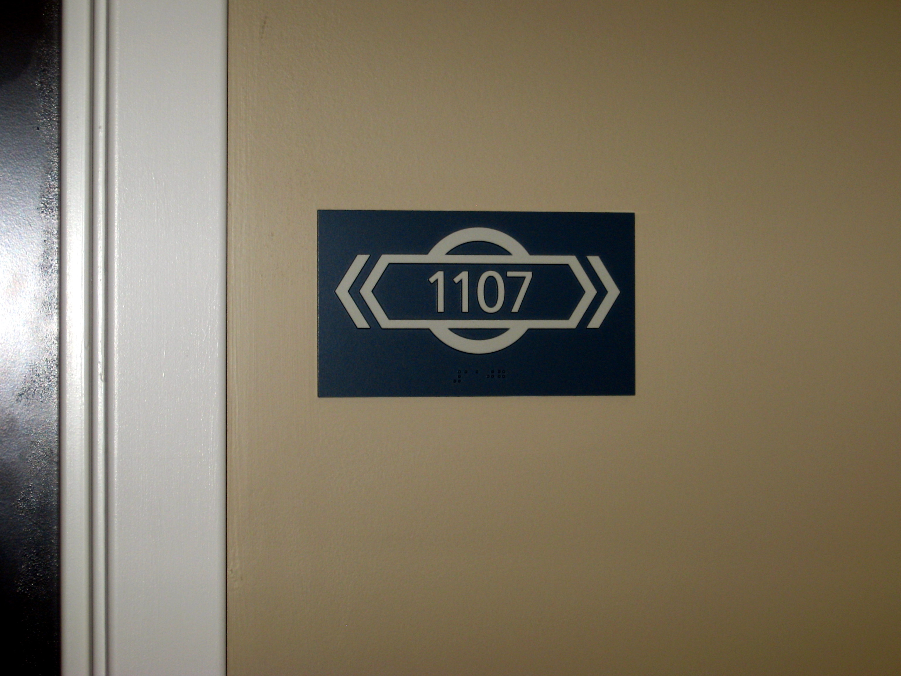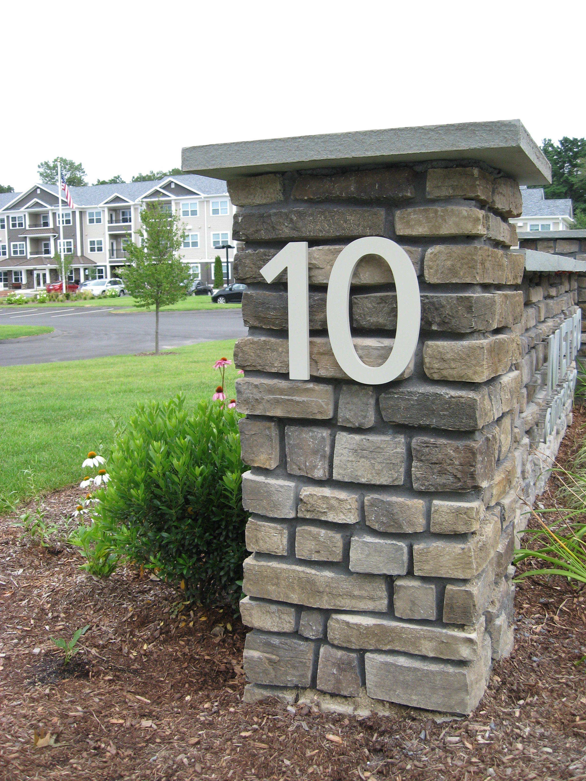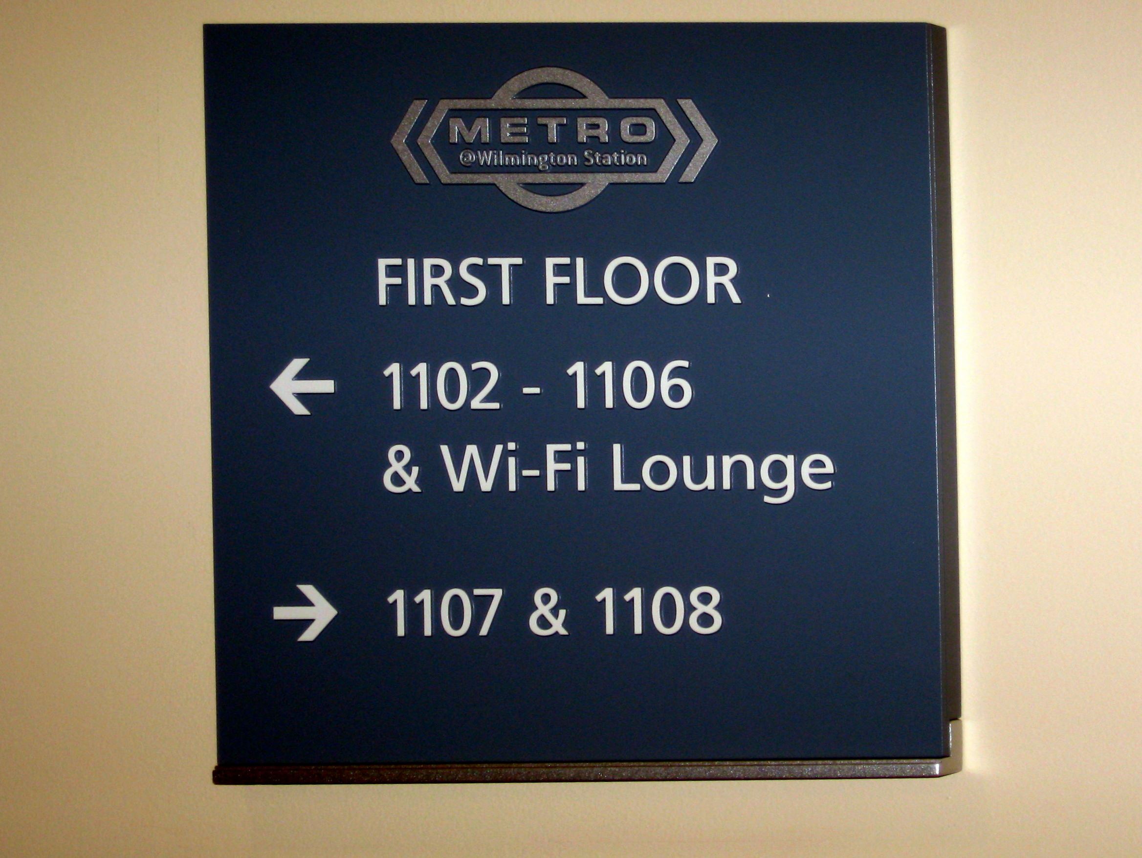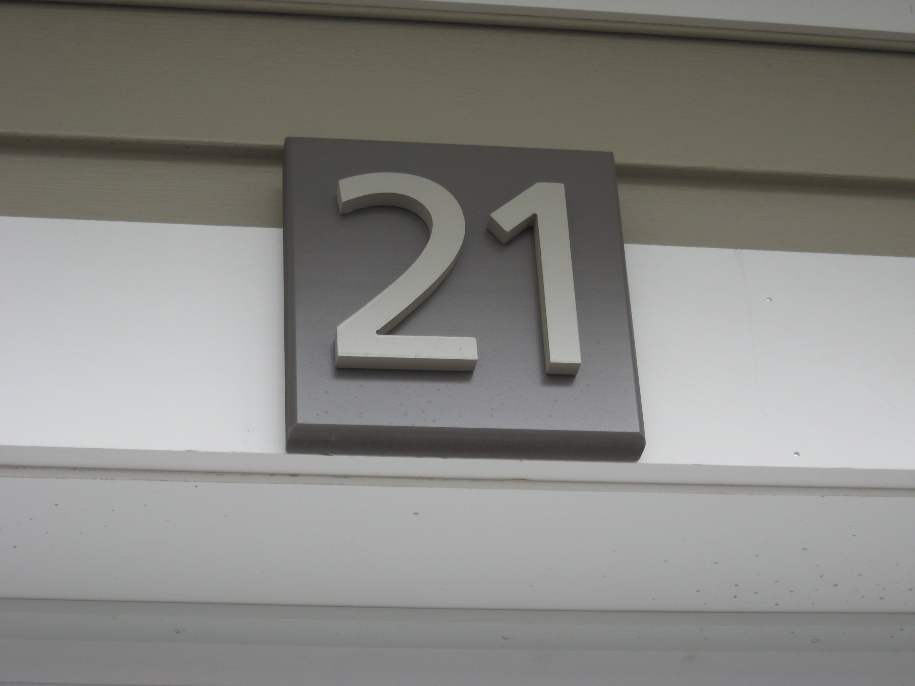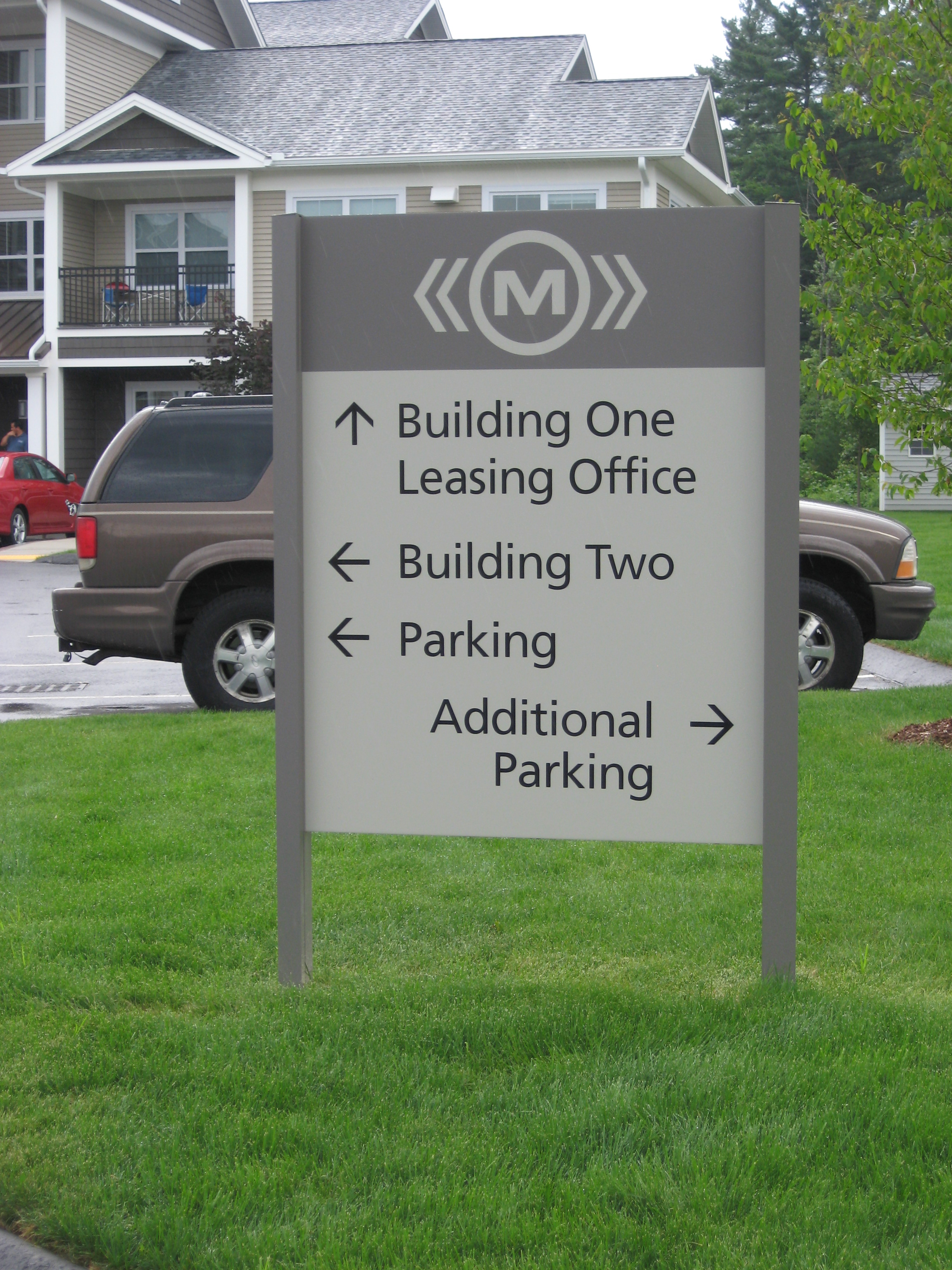 Exterior Directional: Aluminum post and panel with vinyl letters.